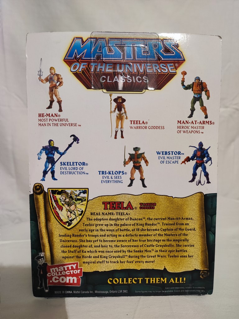 È stata rilasciata all'inizio del primo anno completo di Masters of the Universe Classics come prima figura femminile della linea, ed è anche tra le figure con più accessori, consentendo molti modi per esporre la figura. Teela trae grandi vantaggi dalla scultura aggiornata. L'action figure originale aveva un'armatura di serpente rimovibile, sebbene il personaggio fosse raramente raffigurato con questa nella maggior parte dei media narrativi MOTU. Molti fan avevano molta più familiarità con il modo in cui Teela appariva nella serie animata Filmation. Questa action figure include l'opzione di mostrarla in entrambi i modi, poiché la sua figura è confezionata con una testa aggiuntiva che indossa un elmo dorato, su cui si adatta perfettamente l'armatura di serpente inclusa. Ma ha anche una testa senza elmo intercambiabile che presenta i capelli rossi legati in una corta coda di cavallo che è molto più vicina all'aspetto del cartone animato. Come il giocattolo vintage, è anche dotata del suo bastone di serpente, Ka, e di uno scudo che si aggancia al suo polso proprio come nel giocattolo originale. Include anche una nuova spada, modellata sulla spada inclusa nella versione 200X del personaggio. E come bonus aggiuntivo, Teela è anche confezionata con Zoar il falco. Questo falco è basato sull'aspetto dell'uccello della linea di giocattoli vintage, ma questa volta ridotto a una dimensione più appropriata. L'uccello ha ali articolate e ha persino un'armatura rossa rimovibile e un trespolo su cui stare, il tutto modellato sul giocattolo originale!