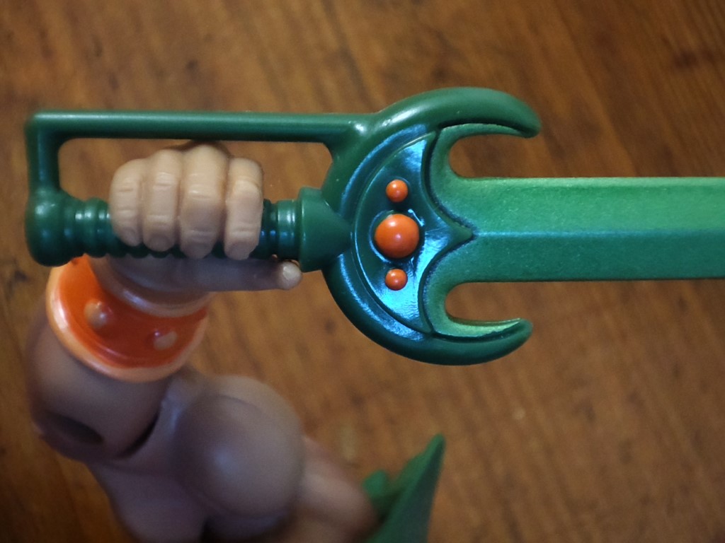 La visiera con i 3 occhi può girare intorno alla testa. Presenti nel package la spada e l'uccello robotico, che nella serie aveva la funzione di robo spia (con il suo piedistallo trasparente).
